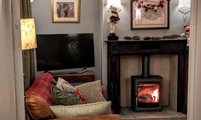 A wood-burning fire casts a gentle glow and a smart TV offers laid-back entertainment. These thoughtful touches come together to create a warm, welcoming haven, perfect for unwinding after a day of exploring.