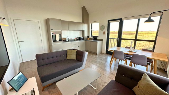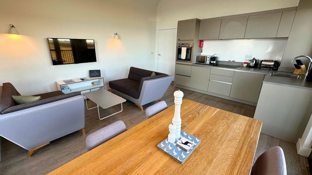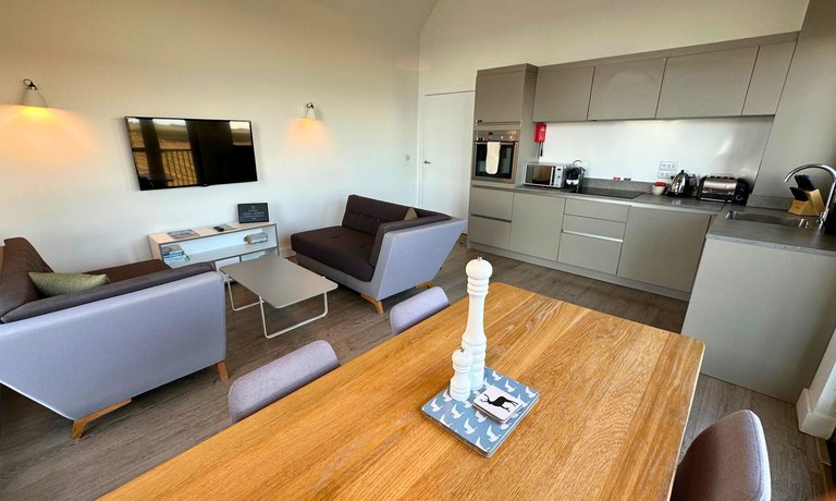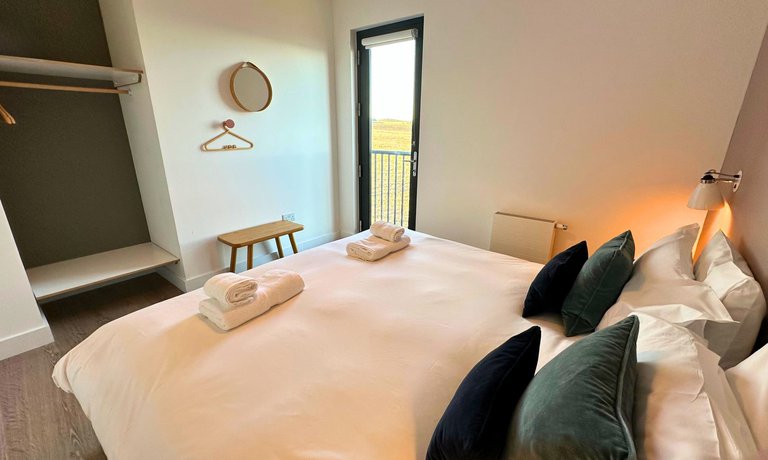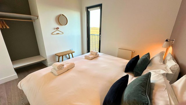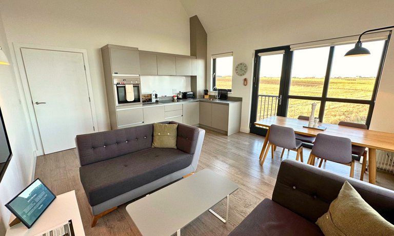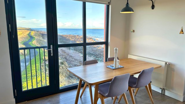 The perfect base for small families, Goldseeker apartment boasts a stylish living area with two inviting sofas, plush furnishings, and a flat-screen TV, perfect for cosy evenings in. The floor to ceiling windows provides an incredible vantage point for guests to enjoy far-reaching views of the dramatic John O’Groats coastline