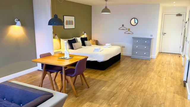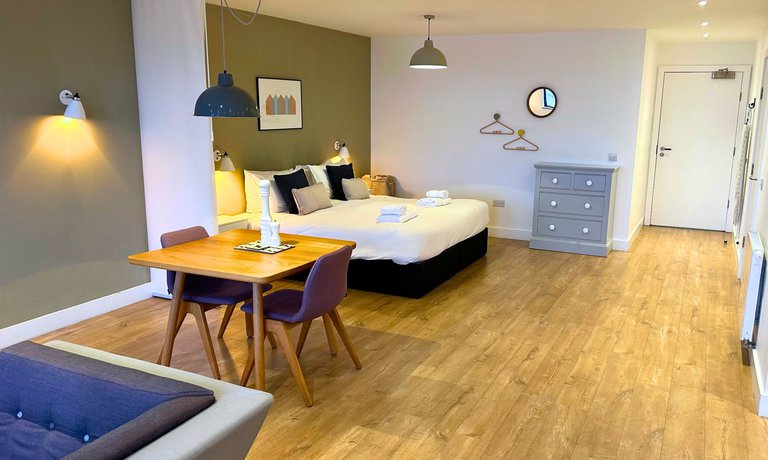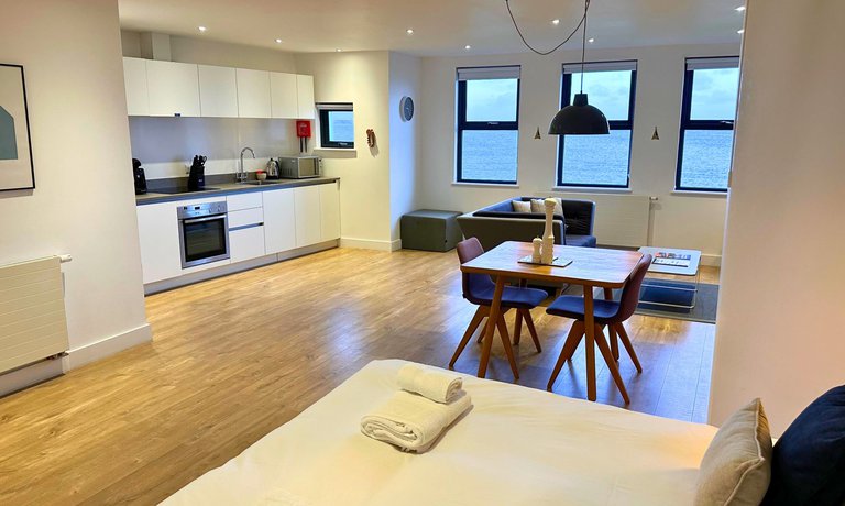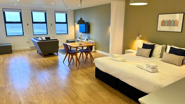 This studio apartment boasts a stylish open-plan living area with an inviting sofa, plush furnishings, and a flat-screen TV, perfect for cosy evenings in. The windows provide a variety of vantage points for guests to enjoy far-reaching views of the dramatic John O’Groats coastal scenery.