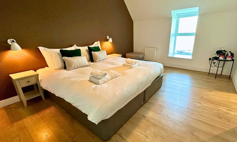 From the bedroom window, guests can gaze out over the harbour and take in sweeping views of the dramatic coastline, all from the comfort of the bedroom.