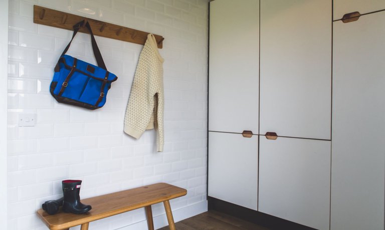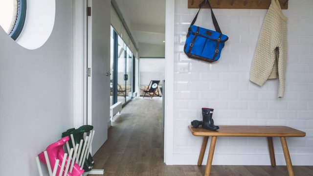Stepping inside, the entrance features a practical boot room with storage for sandy shoes …