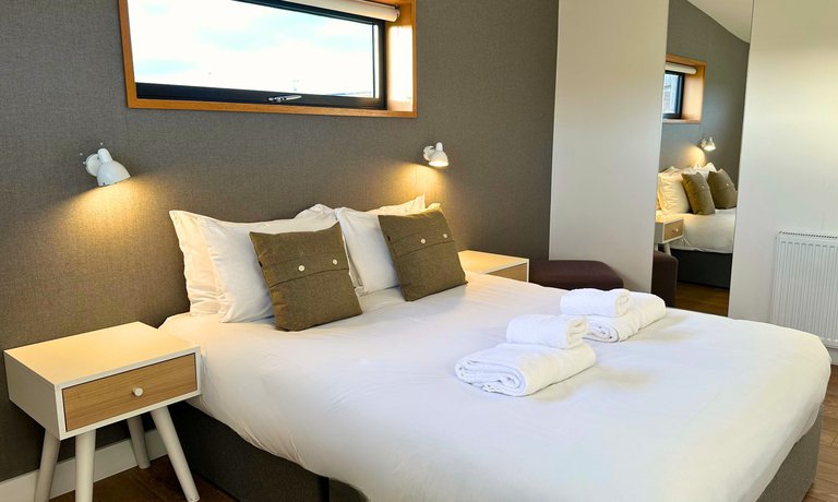 The open‑plan living space boasts an impressive glass frontage that floods the lodge with daylight, enhancing indoor/outdoor living and offering panoramic views in any weather. And while the northern climate can be mixed, guests can always enjoy the warmth of in‑built wood‑burners and deep, comfy sofas. A large flat‑screen TV and free Wi‑Fi ensure young explorers have plenty of entertainment on rainy days.