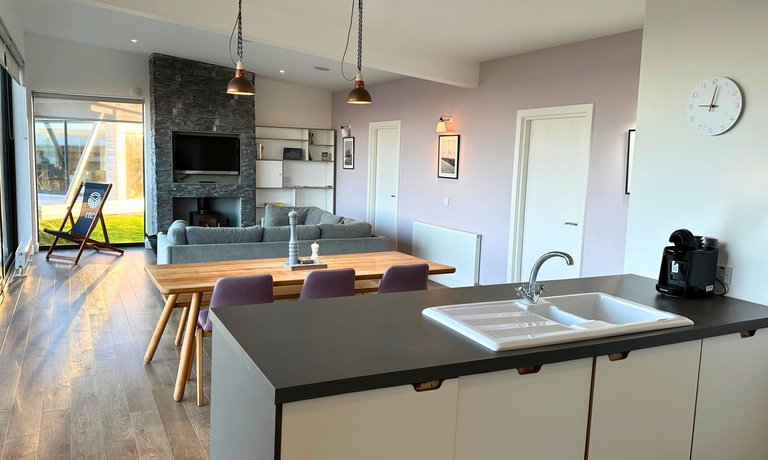 The open‑plan living space boasts an impressive glass frontage that floods the lodge with daylight, enhancing indoor/outdoor living and offering panoramic views of the sea and along the dramatic coastline, and while the northern climate can be mixed, guests can always enjoy the warmth of in‑built wood‑burners and deep, comfy sofas. A large flat‑screen TV and free Wi‑Fi ensure young explorers have plenty of entertainment on rainy days.