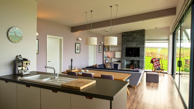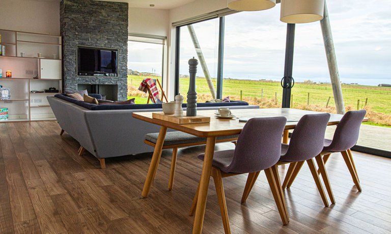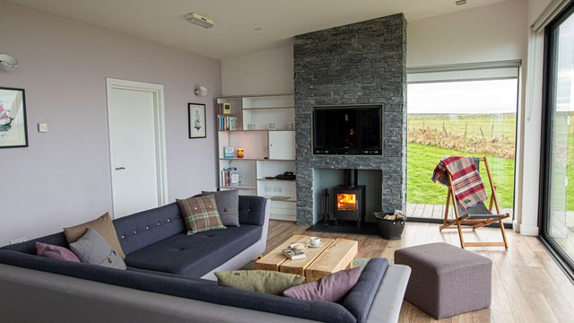 The open‑plan living space boasts an impressive glass frontage that floods the lodge with daylight, enhancing indoor/outdoor living and offering panoramic views of the sea and along the dramatic coastline and while the northern climate can be mixed, guests can always enjoy the warmth of in‑built wood‑burners and deep, comfy sofas. A large flat‑screen TV and free Wi‑Fi ensure young explorers have plenty of entertainment on rainy days.