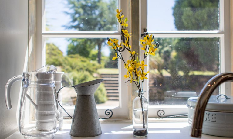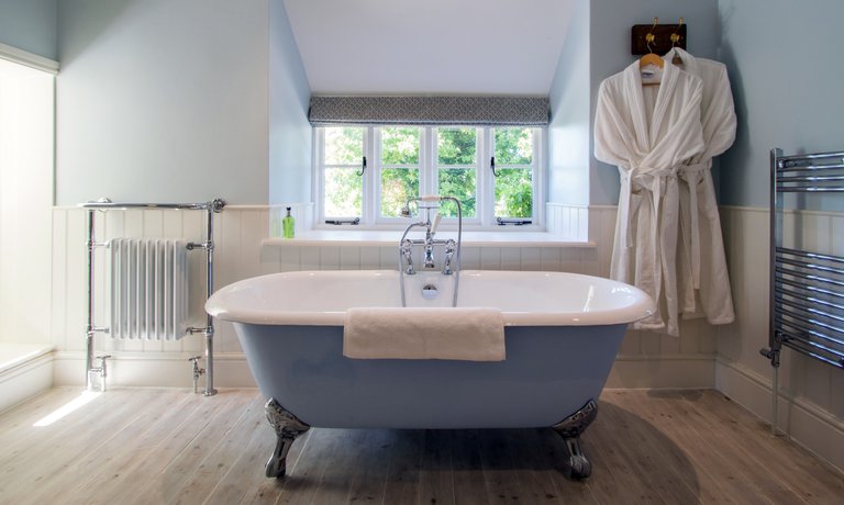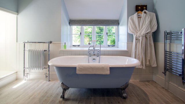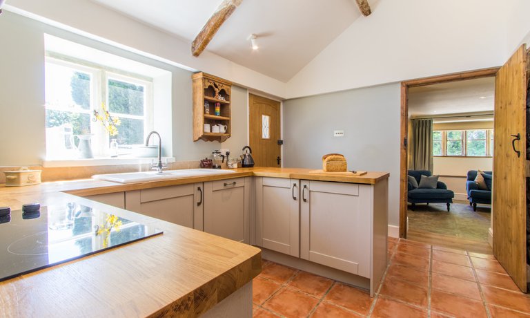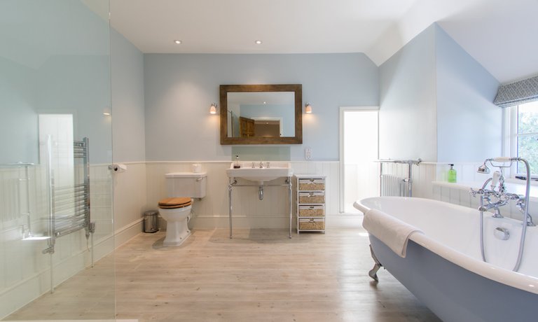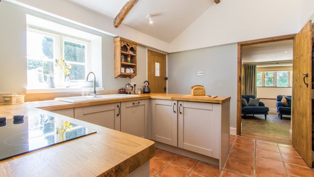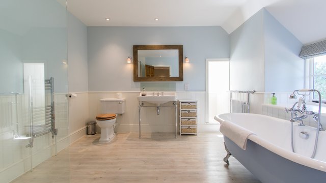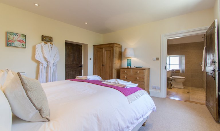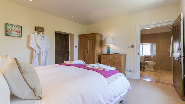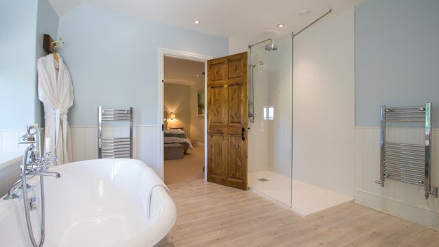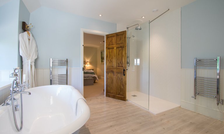 The cottage boasts two comfortable en-suite bedrooms, with deep mattresses, 400 thread count cotton bedding, indulgent mattress toppers and fluffy bathrobes, for full relaxation. The master bedroom is equipped with a king-sized bed and a roll-top bath plus walk-in shower in the spacious bathroom. The second bedroom can be arranged as a super-king or twin, with a walk-in modern wet room complete with heated stone tile floors.