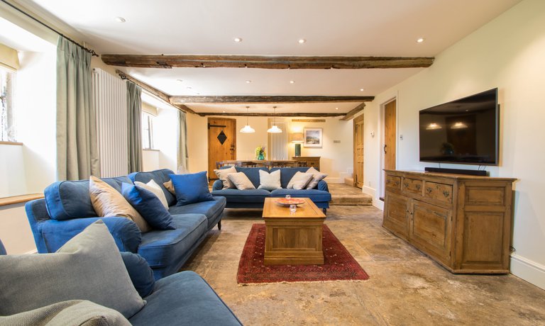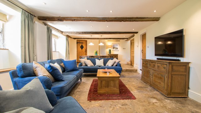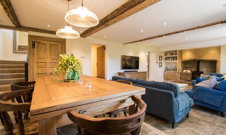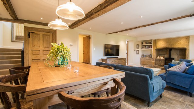 Adjacent to the kitchen, guests can find a spacious, stone-floored living/dining area with a wood-burning stove, 55” flat-screen TV and sumptuous sofas for snoozing. The focal point of this space however is the magnificent dining table that can easily seat 10-12, should you wish to entertain any extra guests. The Bluetooth sound bar is perfect for playing an ambient tune whilst dining, or for really getting knee deep in a great film!