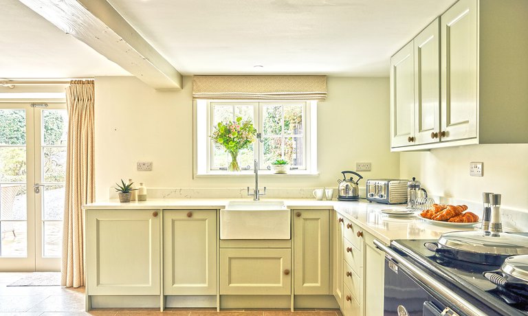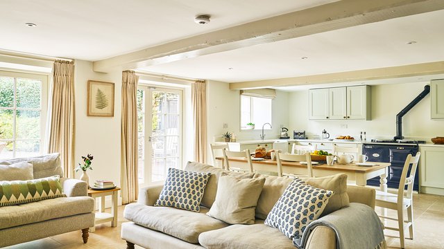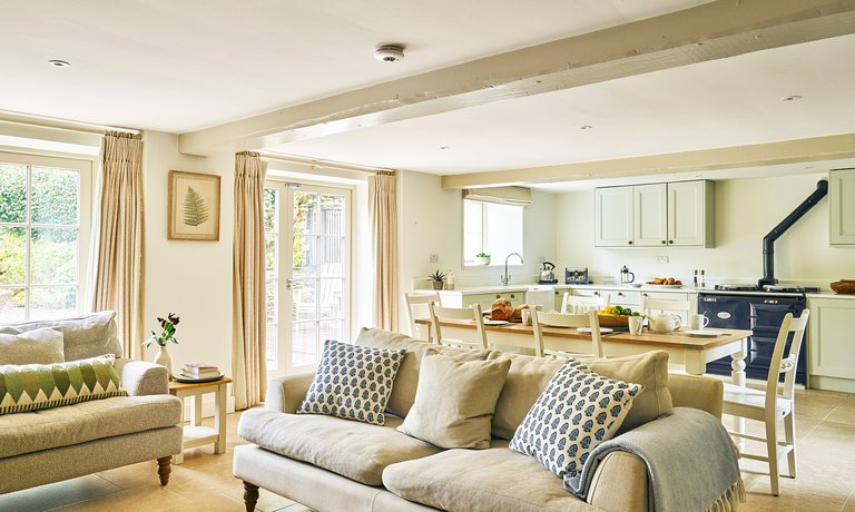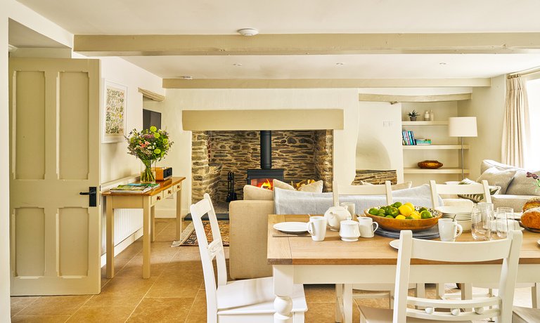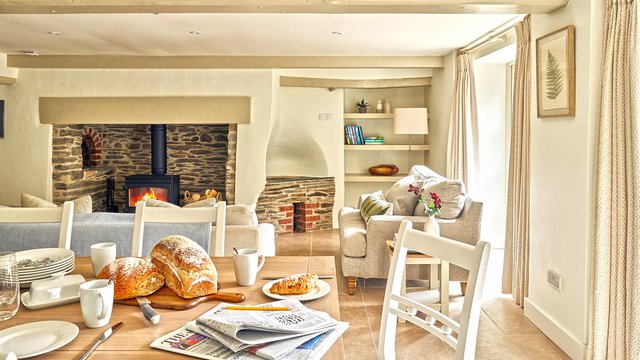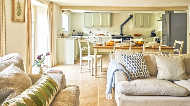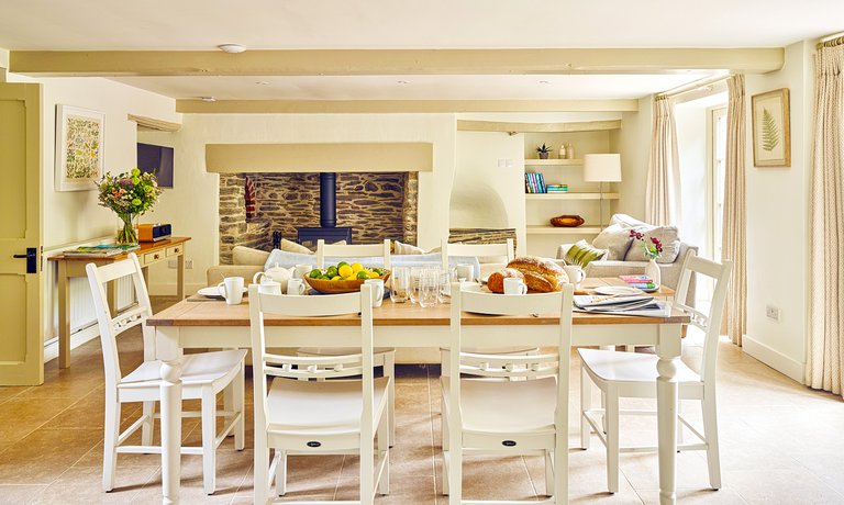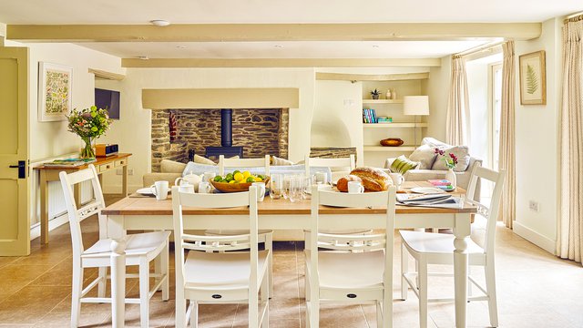 At the heart of the open plan living space is the original Inglenook fireplace, a true focal point of the property, housing a modern wood-burner for ease of use. The log basket is filled (complimentary!) to encourage cosy nights where the popping and crackling of wood provides a soothing soundtrack to heartfelt conversations over a bottle of local wine. With a nod to the modern age, a flat screen television sits in view of the cosy sofas and comforting armchairs so you can enjoy a movie or two to relax.