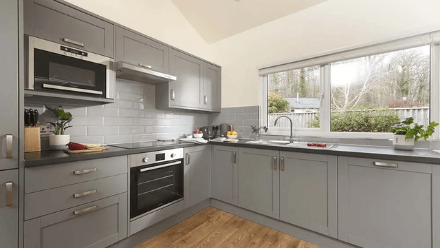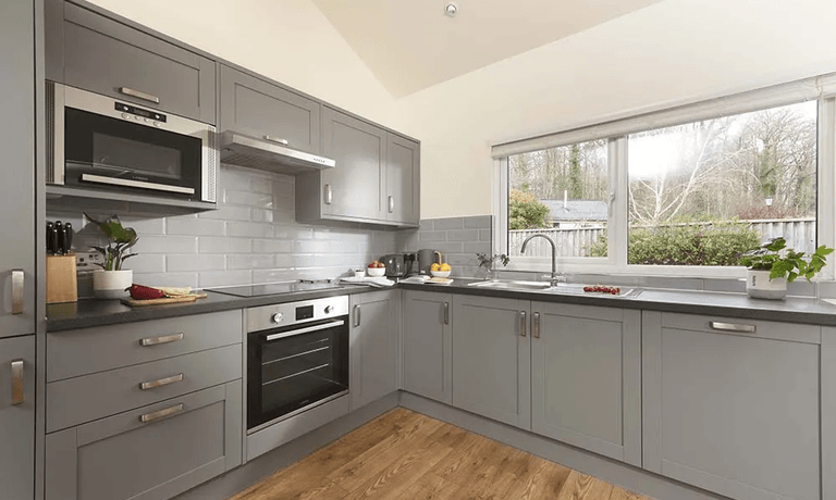 A sleek, modern kitchen comes equipped with everything you could need to create a delicious romantic meal or whip up a hearty breakfast to set you up for the day. It comes complete with an electric oven, hob, microwave, fridge freezer and dishwasher. Adjacent to the kitchen there is a compact, dining table, perfectly sized for two to sit together and enjoy a bite to eat or a morning coffee.